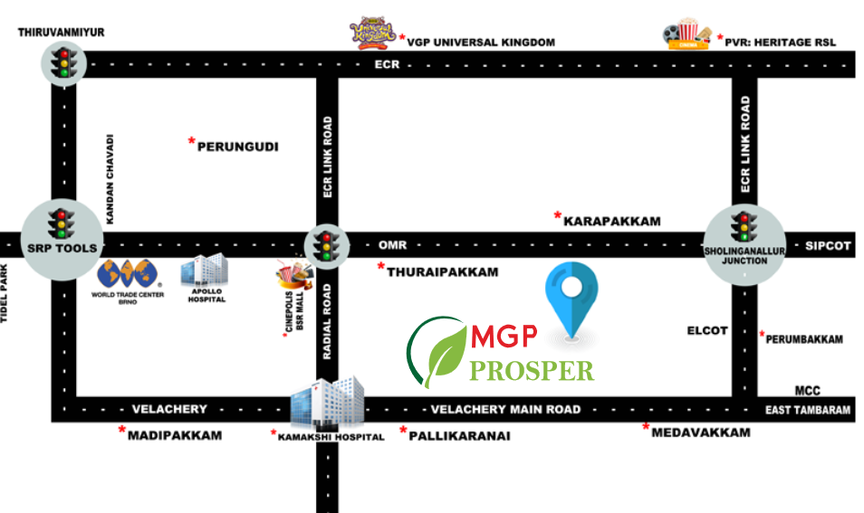 • Located just 2 km from Velachery – Tambaram Main Road & 3 km from PTR