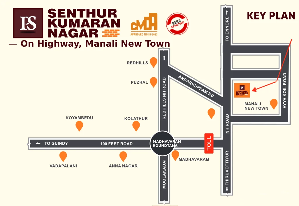 Senthur kumaran Nagar located Manali New Town in Chennai. This location was carefully planned to ensure that residents would need minimal travel time to access schools and Hospitals..Etc. This site is located amdist develoed residential area, Which ensure your convenience / comfort.
