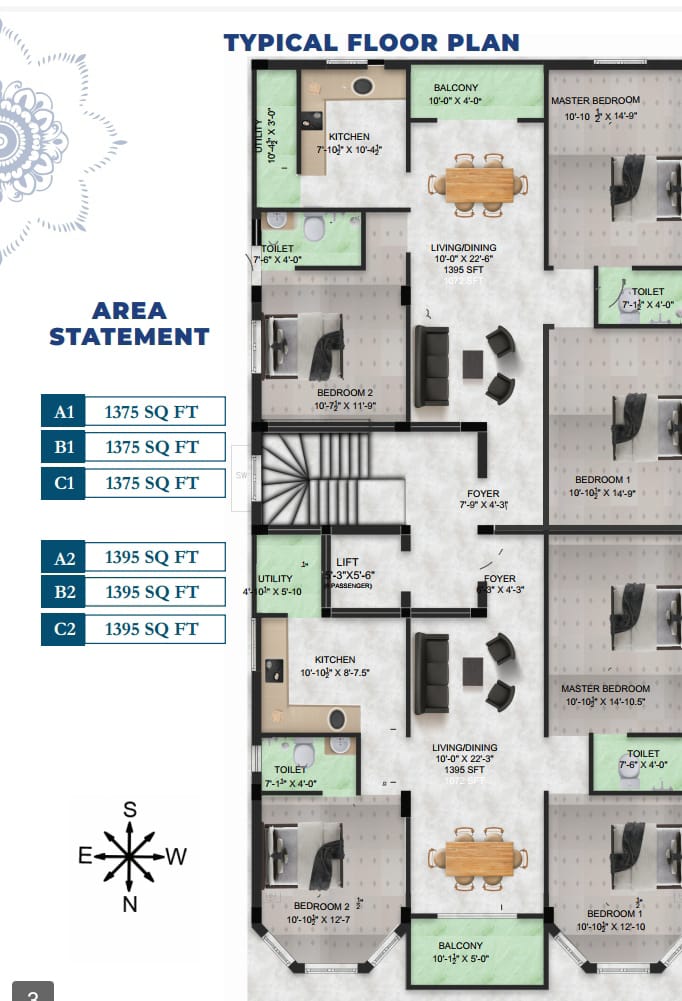 Flat area size – 1395 sqft… 3 Bhk , East facing available….